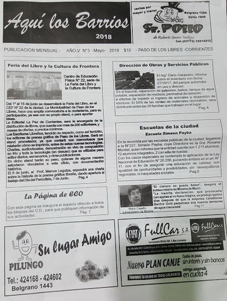 Proponemos a nuestros lectores, los temas que aparecen en la portada impresa de la publicación mensual “Aquí los Barrios”, que aborda diversos temas de interés general. Presenta temas de juventud, ciudad, sociedad y deportes. Tapa completa en interior