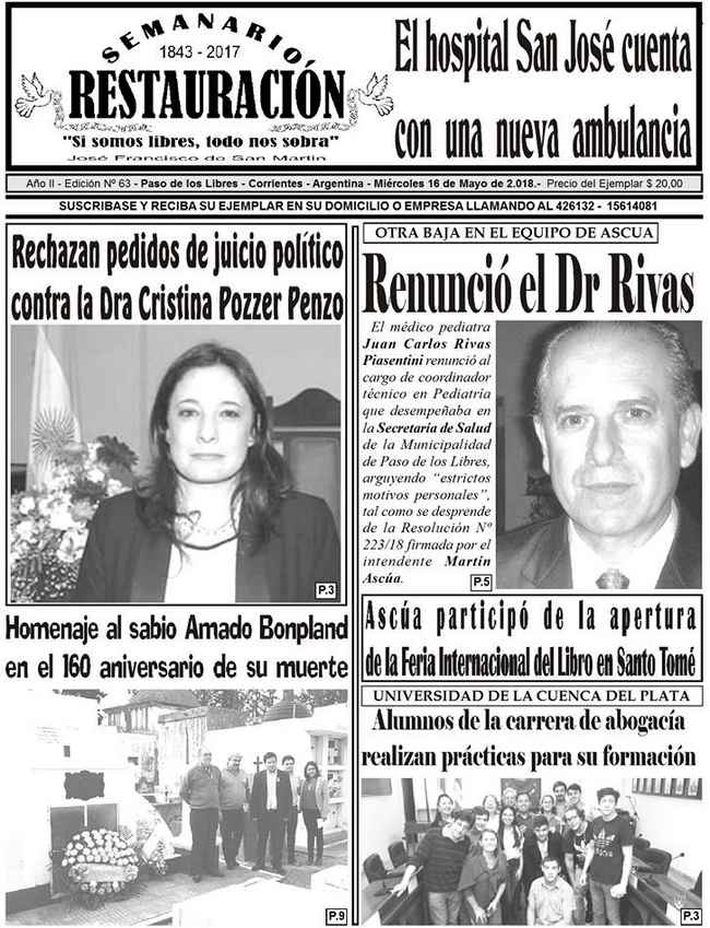 El Semanario Restauración ya se encuentra en las calles de la ciudad. Como cada semana, presenta diversos temas de actualidad. Policiales, Sociales, Entrevistas, Políticos, Deportivos y muchos temas más. Ver la Tapa Completa en Interior.
