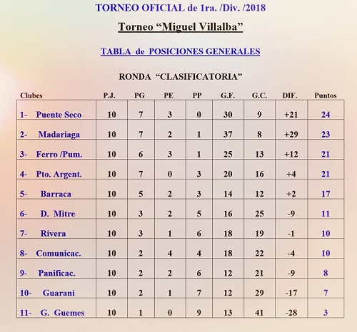 Cumplidas las once fechas previstas para la ronda clasificatoria, ya están los ocho clasificados a la próxima instancia del torneo oficial de primera división. Los cruces también se han dado a conocer y resta programar fecha y hora, lo que ocurrirá este martes en reunión de mesa directiva.