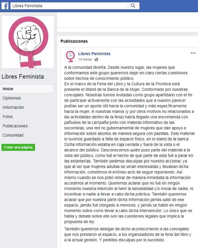 UNA AGRUPACIÓN ACEPTÓ SU RESPONSABILIDAD Polémica por folletos distribuidos en el predio de la feria del libro Fue noticia provincial el martes una polémica desatada por folletos que un grupo de personas distribuían referentes al aborto con pastillas. Una agrupación aceptó el error y pidió disculpas y la secretaría de salud se desvinculó del caso. Hoy el caso llegó a los medios nacionales. La policía de la provincia inició anoche, por orden de la fiscalía, una investigación por instigación al delito.  La molestia de personas que se encontraron con la distribución de estos folletos en la feria del libro y la cultura, fueron rápidamente esparcidas por las redes sociales y llegó este martes a las primeras planas de la provincia y que ya durante las primeras horas de la mañana se publicaba como titular de varios canales de la capital federal.