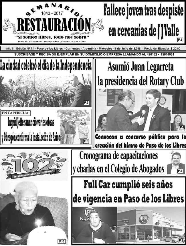 El Semanario Restauración de Paso de los Libres, ya se encuentra en las calles. Como cada semana, presenta diversos temas de actualidad. Policiales, Sociales, Entrevistas, Políticos, Deportivos de nuestra ciudad, la provincia y la nación. Mirá la tapa completa en interior...