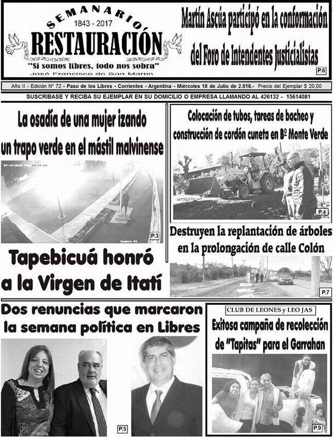 El Semanario Restauración de Paso de los Libres, ya se encuentra en las calles. Como cada semana, presenta diversos temas de actualidad. Policiales, Sociales, Entrevistas, Políticos, Deportivos de nuestra ciudad, la provincia y la nación. Mirá la tapa completa en interior...