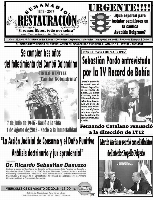 El Semanario Restauración de Paso de los Libres, ya se encuentra en las calles. Como cada semana, presenta diversos temas de actualidad. Policiales, Sociales, Entrevistas, Políticos, Deportivos de nuestra ciudad, la provincia y la nación. Mirá la tapa completa en interior...
