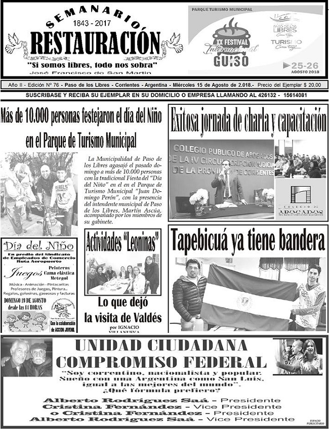 El Semanario Restauración de Paso de los Libres, ya se encuentra en las calles. Como cada semana, presenta diversos temas de actualidad. Policiales, Sociales, Entrevistas, Políticos, Deportivos de nuestra ciudad, la provincia y la nación. Mirá la tapa completa en interior...