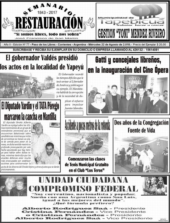 El Semanario Restauración de Paso de los Libres, ya se encuentra en las calles. Como cada semana, presenta diversos temas de actualidad. Policiales, Sociales, Entrevistas, Políticos, Deportivos de nuestra ciudad, la provincia y la nación. Mirá la tapa completa en interior...