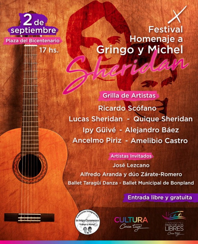 La Municipalidad de Paso de los Libres, a través de la Dirección de Cultura, en conjunto con la Comisión Integración de Amigos Chamameceros “Gringo y Michel Sheridan”, promueve el “X Festival Homenaje a los Hermanos Gringo y Michel Sheridan”, a realizarse el domingo 2 de septiembre, en la plaza Del Bicentenario.