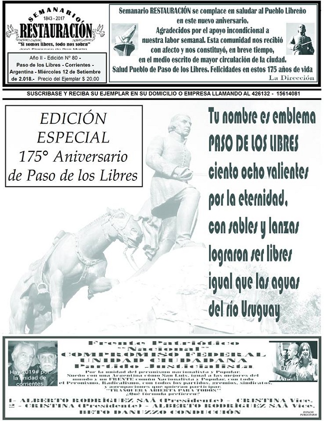 El Semanario Restauración de Paso de los Libres, ya se encuentra en las calles. Como cada semana, presenta diversos temas de actualidad. Policiales, Sociales, Entrevistas, Políticos, Deportivos de nuestra ciudad, la provincia y la nación. Mirá la tapa completa en interior...