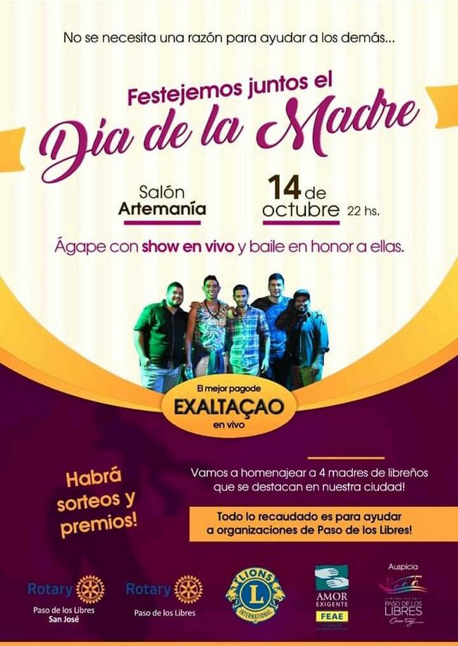 Bajo el lema “No se necesita una razón para ayudar a los demás”, el 14 de octubre en el Salón Artemanía, a las 22 hs. se servirá un ágape con el show en vivo de Exaltacao y baile en honor a las madres. Todo lo recaudado es para ayudar a organizaciones de Paso de los Libres.