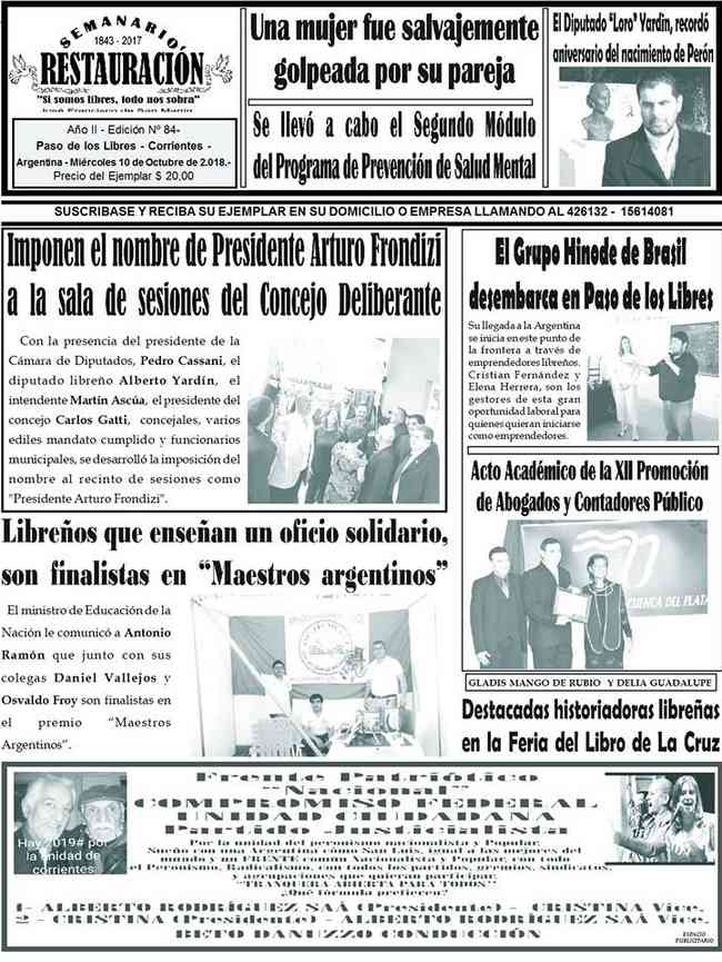 El Semanario Restauración de Paso de los Libres, ya se encuentra en las calles. Como cada semana, presenta diversos temas de actualidad. Policiales, Sociales, Entrevistas, Políticos, Deportivos de nuestra ciudad, la provincia y la nación. Mirá la tapa completa en interior...