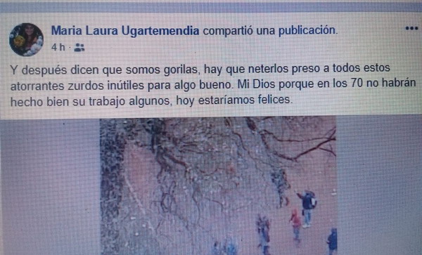 En el posteo, además de una profunda insensibilidad, se nota el desprecio a la vida y deseos de asesinatos, vejámenes y torturas por medio del Estado, invocando paradójicamente a Dios. Su pensamiento contradice el sistema democrático que tanto ha costado alcanzar, además de cometer apología del delito. No podemos ignorar los principios básicos de las leyes nacionales e internacionales, donde se condena y repudia a todo tipo de genocidio, como así también su apología, hechos comprobados en nuestro país en la década que tanto extraña la señora Laura Ugartemendia, delitos de Lesa Humanidad probados y condenados por la Justicia Federal, en todo el territorio nacional, en más de 500 juicios, además de los realizados en países europeos que comprobaron el plan de exterminio sistemático realizado por las dictaduras del Cono Sur, una discusión histórica que fue zanjada.