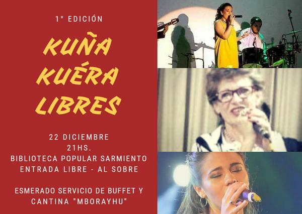 Kuña Kuéra Libres (Mujeres Libres) es un ciclo de shows autogestionados que nace en la ciudad de Paso de los Libres, ante la falta de posibilidades de los artistas locales. Ésta 1° edición se realizará el día 22 de Diciembre a las 21 hs en Biblioteca Popular Sarmiento , con entrada libre al sobre.
