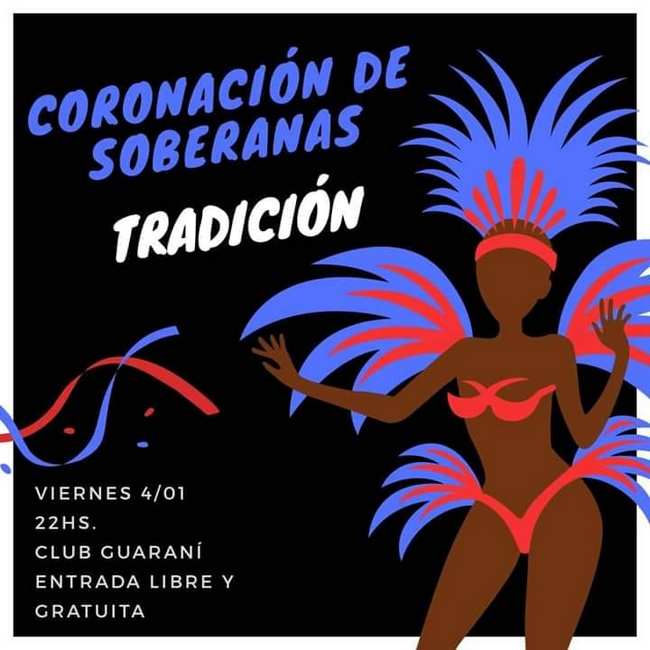 Gente tricolor viernes 04 de enero nuestro gran y unico evento CORONACION DE REINAS , MADRINAS , MUSAS Y BASTONERAS que nos acompañaran en el carnaval 2019 ademas presentacion del samba enredo . Entrada y libre y gratuita CLUB GURANI A PARTIR DE LAS 22HS . VENTA DE MESAS EN RIVADAVIA 1210 O AL 2772 406319 ESPERAMOS EL ACOMPAÑAMIENTO DE TODOS . A.E.S TRADICION