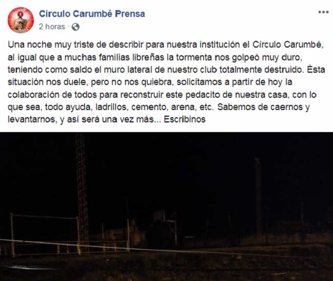 Fue como consecuencia de los fuertes vientos y la cantidad de agua acumulada que, cerca de medianoche, el muro lateral del Circulo Carumbé se desmoronó casi por completo, cayendo a la vereda, quedando en pié unos pocos metros cerca del portón de acceso de vehículos.