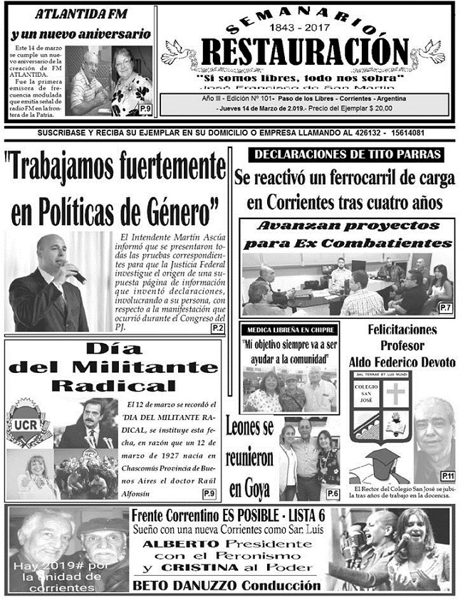 El Semanario Restauración de Paso de los Libres ya se encuentra en las calles. Como cada semana, TodoLibres te adelanta la información que presenta la versión impresa que trata diversos temas de actualidad. Policiales, Sociales, Entrevistas, Políticos, Deportivos de nuestra ciudad, la provincia y la nación. Mirá la tapa completa en interior...