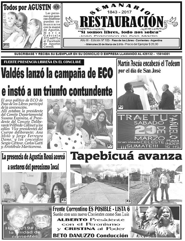 El Semanario Restauración de Paso de los Libres ya se encuentra en las calles. Como cada semana, TodoLibres te adelanta la información que presenta la versión impresa que trata diversos temas de actualidad. Policiales, Sociales, Entrevistas, Políticos, Deportivos de nuestra ciudad, la provincia y la nación. Mirá la tapa completa en interior...