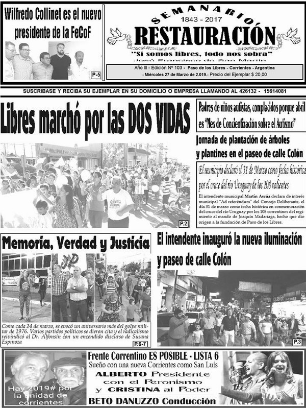 El Semanario Restauración de Paso de los Libres ya se encuentra en las calles. Como cada semana, TodoLibres te adelanta la información que presenta la versión impresa que trata diversos temas de actualidad. Policiales, Sociales, Entrevistas, Políticos, Deportivos de nuestra ciudad, la provincia y la nación. Mirá la tapa completa en interior...