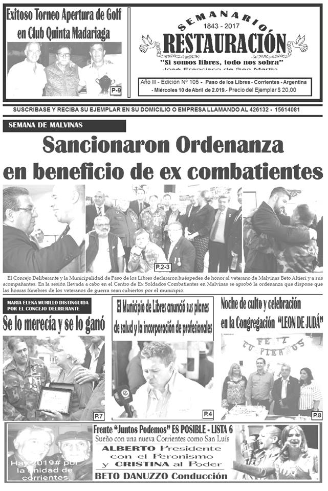 El Semanario Restauración de Paso de los Libres ya se encuentra en las calles. Como cada semana, TodoLibres te adelanta la información que presenta la versión impresa que trata diversos temas de actualidad. Policiales, Sociales, Entrevistas, Políticos, Deportivos de nuestra ciudad, la provincia y la nación. Mirá la tapa completa en interior...