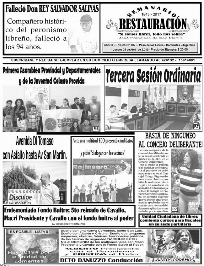 El Semanario Restauración de Paso de los Libres ya se encuentra en las calles. Como cada semana, TodoLibres te adelanta la información que presenta la versión impresa que trata diversos temas de actualidad. Policiales, Sociales, Entrevistas, Políticos, Deportivos de nuestra ciudad, la provincia y la nación. Mirá la tapa completa en interior...