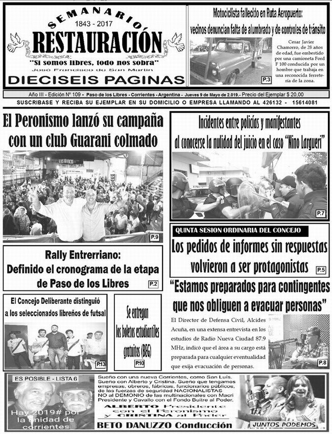 El Semanario Restauración de Paso de los Libres ya se encuentra en las calles. Como cada semana, TodoLibres te adelanta la información que presenta la versión impresa que trata diversos temas de actualidad. Policiales, Sociales, Entrevistas, Políticos, Deportivos de nuestra ciudad, la provincia y la nación. Mirá la tapa completa en interior...