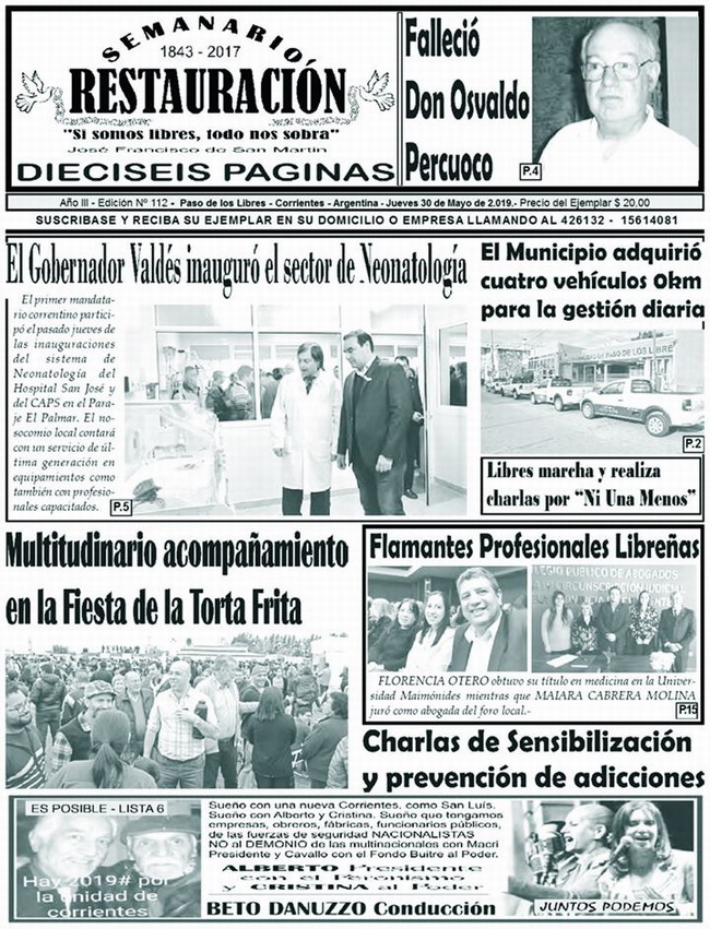 El Semanario Restauración de Paso de los Libres ya se encuentra en las calles. Como cada semana, TodoLibres te adelanta la información que presenta la versión impresa que trata diversos temas de actualidad. Policiales, Sociales, Entrevistas, Políticos, Deportivos de nuestra ciudad, la provincia y la nación. Mirá la tapa completa en interior...
