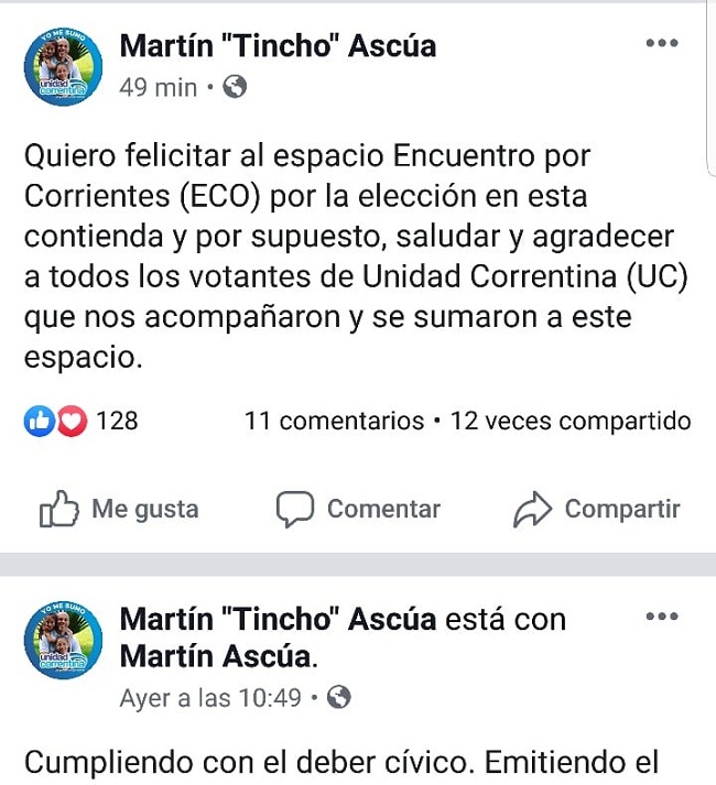 En el primer mensaje, Ascúa indicó: "Quiero felicitar al espacio Encuentro por Corrientes (Eco) por la elección en esta contienda y por supuesto, saludar y agradecer a todos los votantes de Unidad Correntina (UC) que nos acompañaron y se sumaron a este espacio."