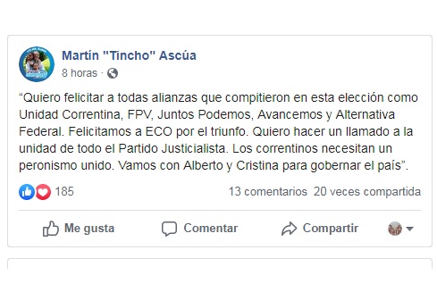 El Intendente de Paso de los Libres y lider de Unidad Correntina, Martín Ascúa, poco antes de medianoche, se expresó por su cuenta de la red social facebook para hacer llegar su mensaje, felicitando al frente ganador y pidiendo la unidad del Partido Justicialista. "Los correntinos necesitan un peronismo unido", indicó.