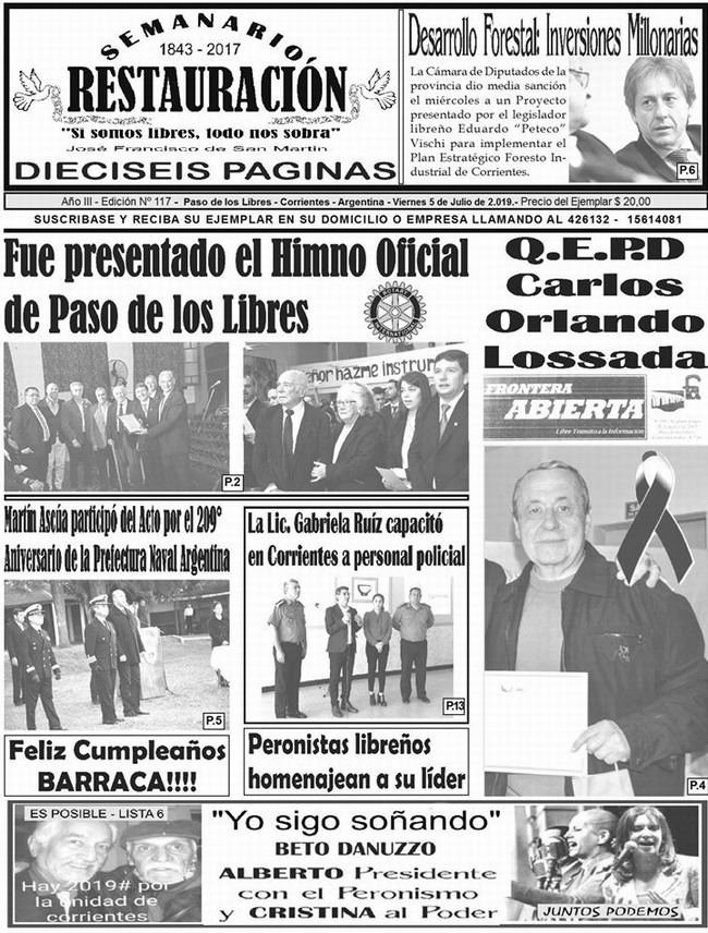 El Semanario Restauración de Paso de los Libres ya se encuentra en las calles. Como cada semana, TodoLibres te adelanta la información que presenta la versión impresa que trata diversos temas de actualidad. Policiales, Sociales, Entrevistas, Políticos, Deportivos de nuestra ciudad, la provincia y la nación. Mirá la tapa completa en interior...