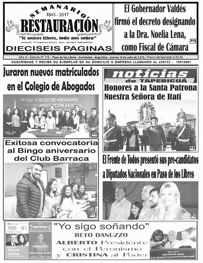 El Semanario Restauración de Paso de los Libres ya se encuentra en las calles. Como cada semana, TodoLibres te adelanta la información que presenta la versión impresa que trata diversos temas de actualidad. Policiales, Sociales, Entrevistas, Políticos, Deportivos de nuestra ciudad, la provincia y la nación. Mirá la tapa completa en interior...