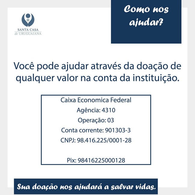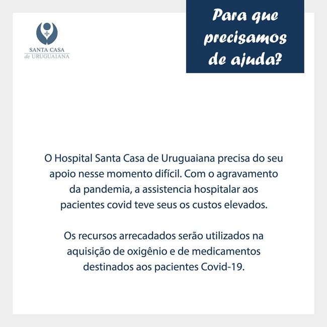 Es el lema que está utilizando el Hospital Santa Casa de Caridade de Uruguaiana para solicitar encarecidamente ayuda económica, no importa el monto que sea, todo será bienvenido indican desde el nosocomio de la vecina ciudad de Uruguayana. Lo recaudado será utilizado para compra de oxígeno, medicamentos varios que se utilizan día a día para los pacientes que tienen coronavirus.