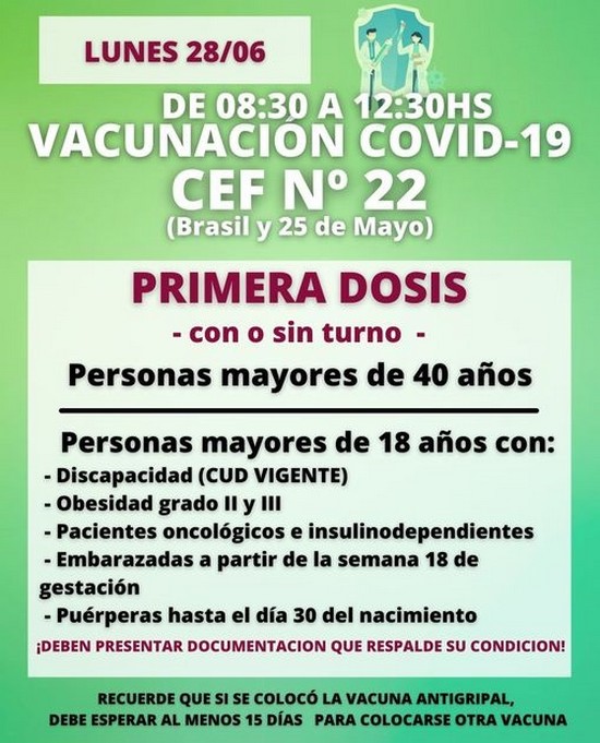 Vacunas Este lunes continúa la campaña de vacunación en el C.E.F. Nº22 Este Lunes sigue la campaña de vacunación en las instalaciones del C.E.F. (Centro de Educación Física) Nº 22. Desde el nosocomio local informan que como lo hicieron los días viernes y sábado seguirán vacunando a personas mayores de 40 años con o sin turno. También se agrega para personas que ya se hayan colocado la 1ra dosis de COVISHIELD O ASTRAZENECA hace más de 28 días o más.