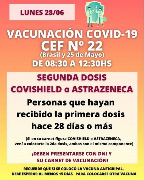 (SI EN TU CARNET FIGURA COVISHIELD O ASTRAZENECA, VENÍ A COLOCARTE LA 2DA DOSIS, AMBAS SON EL MISMO COMPONENTE) ¡ DEBEN PRESENTAR SU DNI Y SU CARNET DE VACUNACIÓN ! Debemos respetar todas las medidas de seguridad para cuidarnos todos