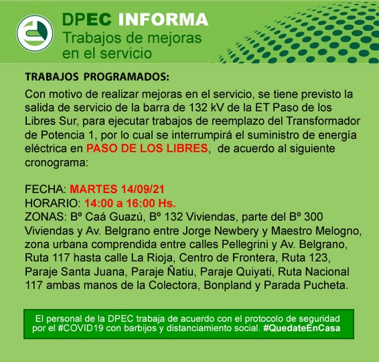 CORTE DE ENERGÍA PROGRAMADO Habrá cortes de energía en Paso de los Libres La Dirección Provincial de Energía de Corrientes (DPEC) informa que con motivo de realizar mejoras en el servicio, se tiene previsto la salida de servicio de la barra de 132 kV de la ET Paso de los Libres Sur, para ejecutar trabajos de reemplazo del Transformador de Potencia 1, por lo cual se interrumpirá el suministro de energía eléctrica en Paso de los Libres, este martes 14 de 14:00 a 16:00, en las siguientes zonas.  La Dirección Provincial de Energía de Corrientes (DPEC) informa que con motivo de realizar mejoras en el servicio, se tiene previsto la salida de servicio de la barra de 132 kV de la ET Paso de los Libres Sur, para ejecutar trabajos de reemplazo del Transformador de Potencia 1, por lo cual se interrumpirá el suministro de energía eléctrica en Paso de los Libres, este martes 14 de 14:00 a 16:00, en Bº Caá Guazú, Bº 132 Viviendas, parte del Bº 300 Viviendas y Av. Belgrano entre Jorge Newbery y Maestro Melogno, zona urbana comprendida entre calles Pellegrini y Av. Belgrano, Ruta 117 hasta calle La Rioja, Centro de Frontera, Ruta 123, Paraje Santa Juana, Paraje Ñatiu, Paraje Quiyati, Ruta Nacional 117 ambas manos de la Colectora, Bonpland y Parada Pucheta.