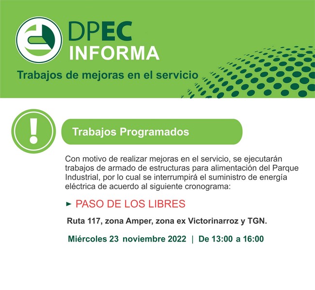 La Dirección Provincial de Energía de Corrientes (DPEC) informa que con motivo de realizar mejoras en el servicio, se ejecutarán tareas de armado de estructuras para alimentación del Parque Industrial, por lo cual se interrumpirá el suministro de energía eléctrica en la localidad de Paso de los Libres, este miércoles 23 de 13 a 16 en la Ruta Nacional 117, zona Amper, zona ex Victorinarroz y TGN.
