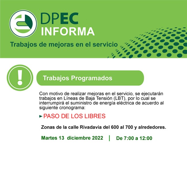 La Dirección Provincial de Energía de Corrientes (DPEC) informa que con motivo de realizar mejoras en el servicio, se ejecutarán trabajos en Líneas de Baja Tensión (LBT), por lo cual se interrumpirá el suministro de energía eléctrica en la localidad de PASO DE LOS LIBRES, de acuerdo al siguiente cronograma: