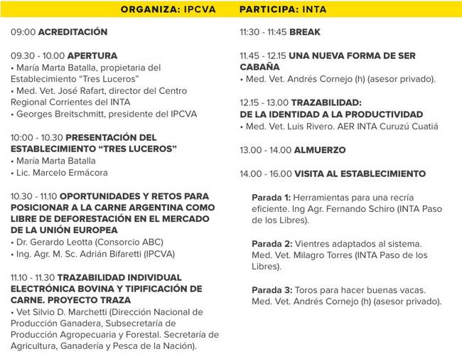 La apertura del encuentro estará a cargo de María Marta Batalla, propietaria de “Tres Luceros”, José Rafart, director del Centro Regional Corrientes del INTA, y Georges Breitschmitt, presidente del IPCVA.