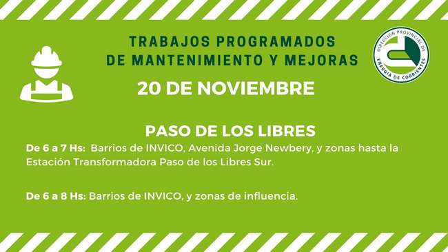 La Dirección Provincial de Energía de Corrientes (DPEC) informa que con motivo de realizar mejoras en el servicio, se ejecutarán tareas de poda sobre la traza de Líneas de Media Tensión, por lo cual se interrumpirá el suministro de energía eléctrica en la localidad de PASO DE LOS LIBRES, de acuerdo al siguiente cronograma: