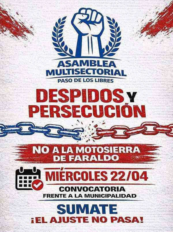 “No a la motosierra de -Agustín- Faraldo”, es la consigna de la Asociación de Trabajadores del Estado (ATE), para una concentración matutina este miércoles 22 de abril frente a la sede municipal de Paso de los Libres.
