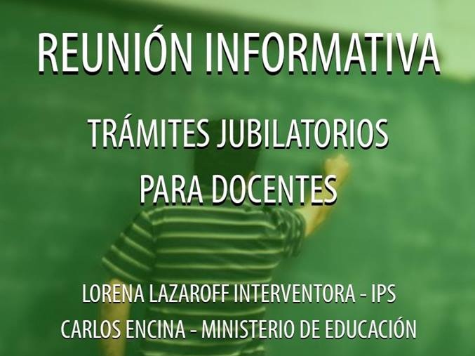 Este martes, se realiza una reunión de carácter informativa para docentes con trámites próximos a jubilarse. Será a las 17 horas en Club Progreso. Allí estará presente Lorena Lazaroff, Interventora del Instituto de previsión Social y Carlos Encina del Ministerio de Educación.