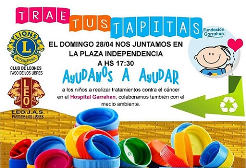 El próximo domingo, el Club de Leones junto a Leo Jas, realizarán un evento donde el eje central es motivar a la comunidad, a donar tapitas de plástico de botellas para continuar con el aporte a la Fundación del Hospital Garrahan y su programa de reciclado y medio ambiente.