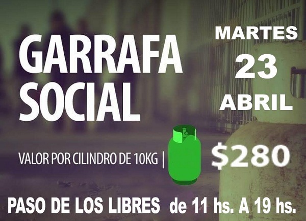 Vuelve el Operativo de la Garrada Social. Será el martes 23 de 11 a 19 horas, lugar donde los vecinos de Paso de los Libres, podrán adquirir el cilindro de 10 kilogramos a $ 280 en la Delegación del Ministerio de Desarrollo Social (Felix María Gómez y A. Rojas), detrás del Hospital San José.