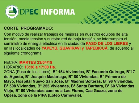La Dirección Provincial de Energía de Corrientes, informa que con motivo de realizar trabajos de mejoras en equipos de alta tensión, media tensión y red de baja tensión, se interrumpirá el suministro de energía eléctrica en la ciudad de PASO DE LOS LIBRES y en la localidades de YAPEYÚ, GUAVIRAVÍ y TAPEBICUÁ, de acuerdo al siguiente cronograma (Ver en interior).
