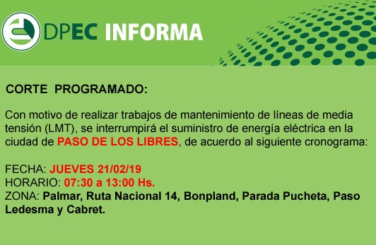 La Dirección Provincial de Energía de Corrientes (DPEC) informa que con motivo de realizar trabajos de mantenimiento en líneas de media tensión (LMT), se interrumpirá el suministro de energía eléctrica en la localidad de PASO DE LOS LIBRES, de acuerdo al siguiente cronograma (ver en interior).
