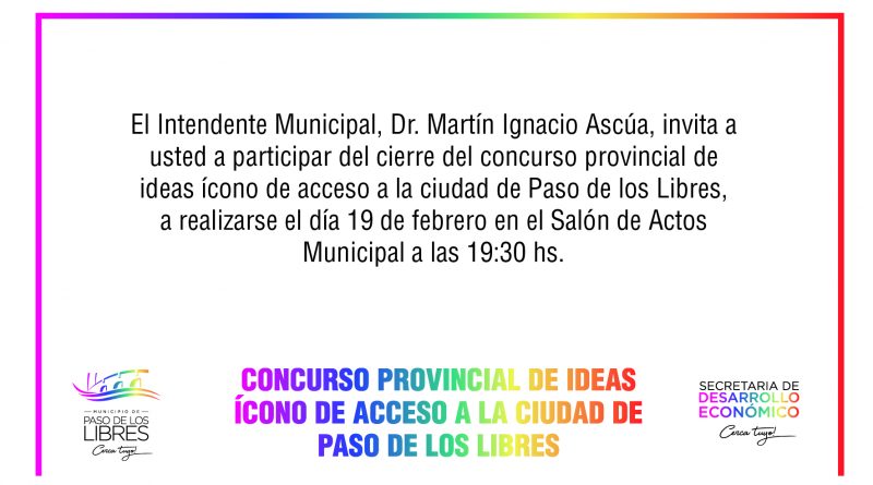La Secretaría de Desarrollo Económico, a cargo de César Barés, informa a la comunidad que el día martes 19 de febrero, a las 19:30 hs, tendrá lugar en el salón de actos municipal el cierre del Concurso Provincial de ideas Icono de Acceso a la ciudad de Paso de losLibres.