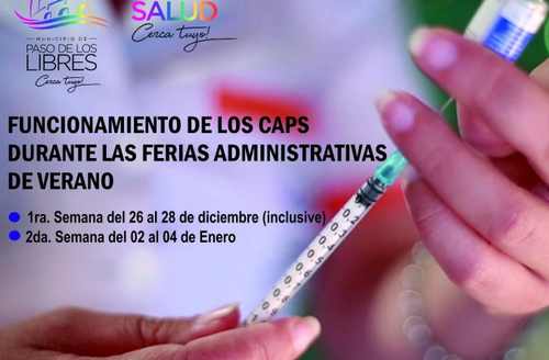 Desde la Secretaría de Salud de la Municipalidad de Paso de los Libres, se informa a la comunidad que durante las ferias administrativas de verano (Resolución Nº 499 D.E.M.), permanecerán ABIERTOS los Centros de Atención Primaria de Salud (CAPS), conforme al siguiente cronograma: (ver interior)