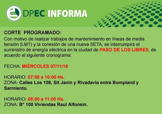 La Dirección Provincial de Energía de Corrientes (DPEC) informa que con motivo de realizar tareas de mantenimiento en líneas de media tensión (LMT), se interrumpirá el suministro de energía eléctrica en la ciudad de PASO DE LOS LIBRES, de acuerdo al siguiente cronograma