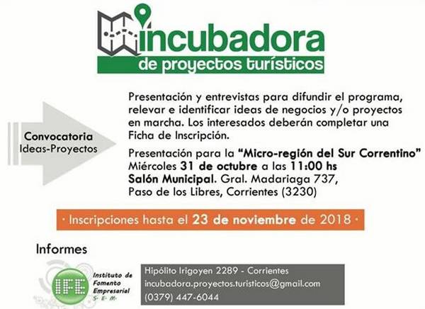 Desde la Dirección de Turismo de la Municipalidad de Paso de los Libres, se invita a la comunidad a la presentación “Micro-región del Sur Correntino” perteneciente al Programa Incubadora de Proyectos Turísticos, a realizarse este miércoles en el Salón Municipal, sito en Madariaga 737.