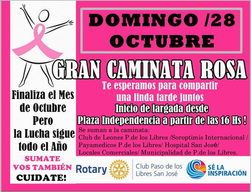 El Municipio de Paso de los Libres a través del Área Mujer, Género y Diversidad y la Secretaría de Salud, se suma a las actividades programadas para el domingo 28 de octubre, en el marco de la lucha contra el cáncer de mama, destinada a concientizar y prevenir acerca de la detección temprana de la afección que aqueja a millones de mujeres en el mundo.