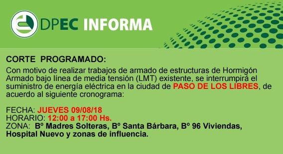 La Dirección Provincial de Energía de Corrientes (DPEC) informa que con motivo de realizar trabajos de mantenimiento se tiene previsto cortes de energía en Paso de los Libres, este jueves 09 de 12 a 17, en los barrios Madres Solteras, Santa Bárbara, 96 Viviendas, Hospital Nuevo y zonas de influencia.