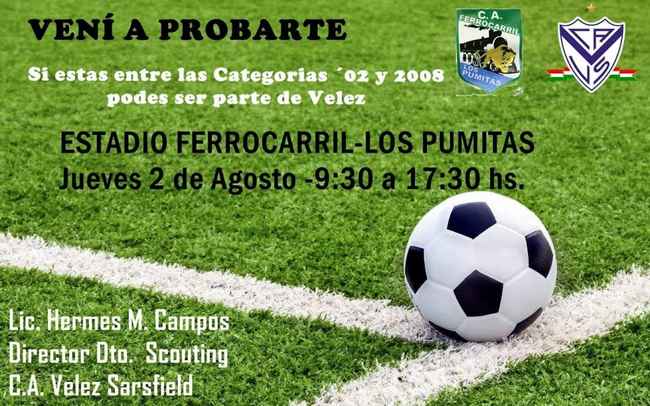 Desde el Club Ferrocarril Los Pumitas, informaron a la redacción de Todo Libres, que el próximo día jueves, 2 de agosto, el Director del Departamento de Scouting del Club Vélez Sarsfield estará en la ciudad para realizar prueba de jugadores infantil en el campo de juego de esa institución.