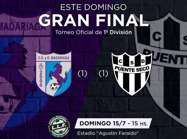 Con gran expectativa, llega a su fin el torneo oficial de primera división, que consagrará este domingo a Puente Seco o al Club Madariaga, quienes vienen de un empate (1-1) en el partido de ida. El mismo día, está previsto que se juegue la semifinal de quinta división.